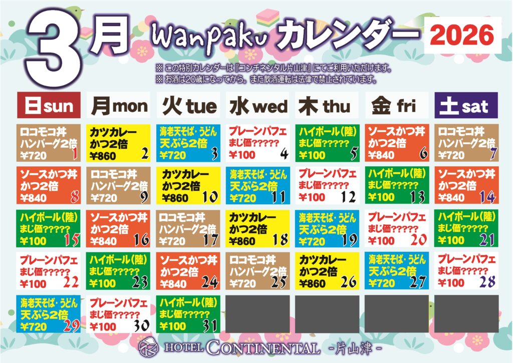 コンチネンタル片山津、3月も『わんぱくカレンダー』をさせていただきます。是非ともお越しくださいませ。