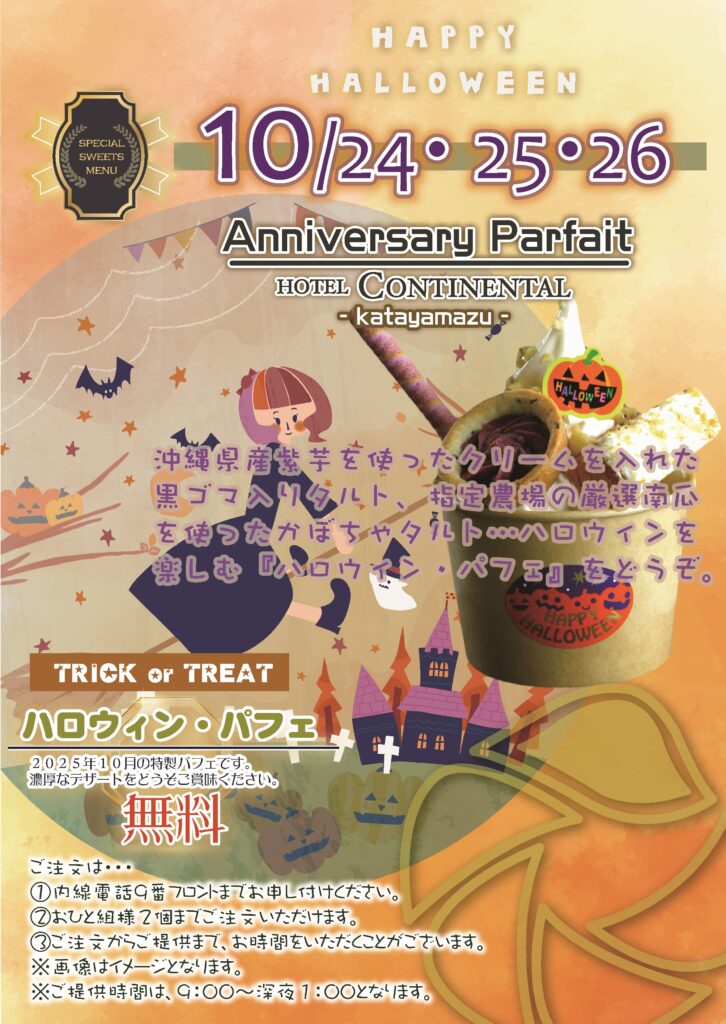 かぼちゃタルトや紫芋タルトなどを使った『ハロウィン・パフェ』を無料にてご用意しております。