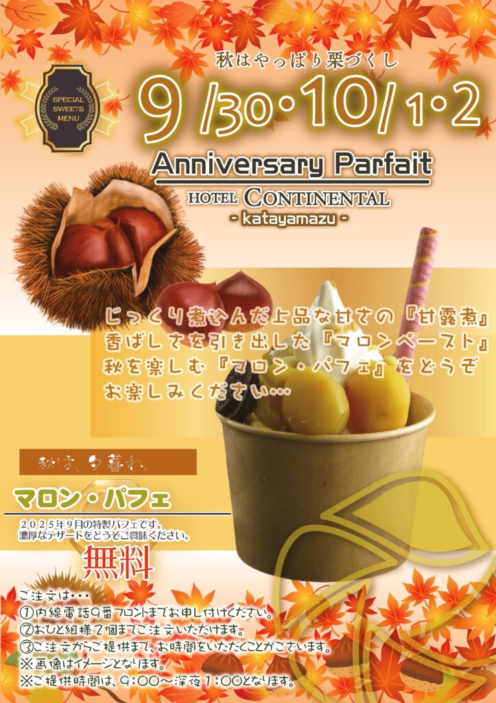 コンチネンタル片山津では、9月30日、10月1日・2日の3日間にお越しいただいたお客様に、栗の甘露煮やマロンペーストを使った『マロン・パフェ』を無料にてご用意しております。