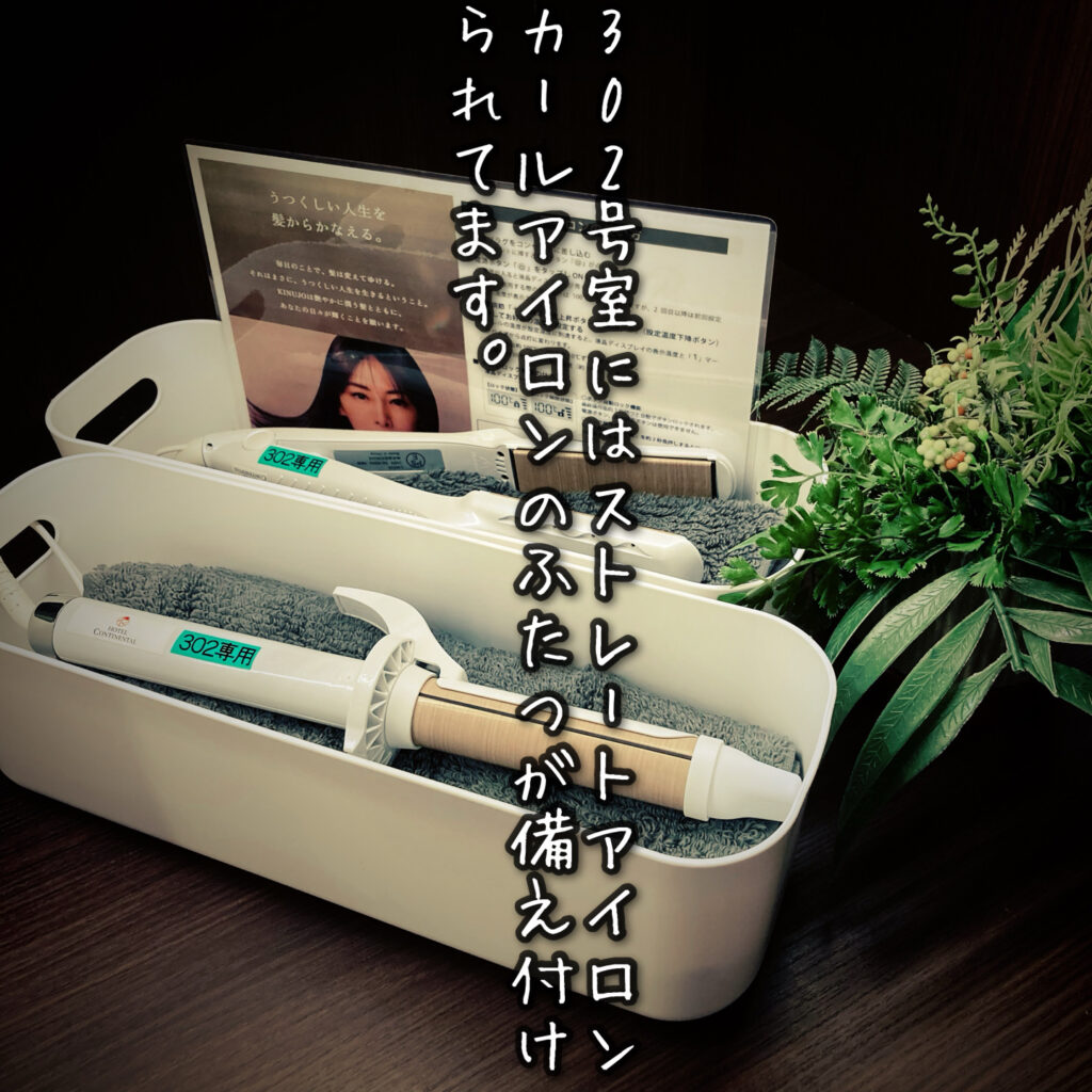 画像は302号室のヘアアイロン…『絹女 KINUJO』のストレートアイロンとカールアイロンのふたつを備え付け、お客様のお越しをお待ちしてます。