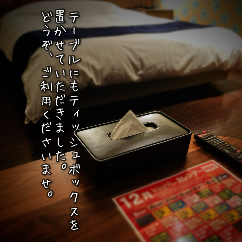 「ベッドのところだけでなく、テーブルのところにもティッシュが欲しい。」にお応えすることが出来ました。